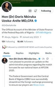 The Minister of State for Finance, Mrs Doris Uzoka-Anite, says administrative processes for Super Eagles’ AFCON 2025 match bonuses have been successfully streamlined.