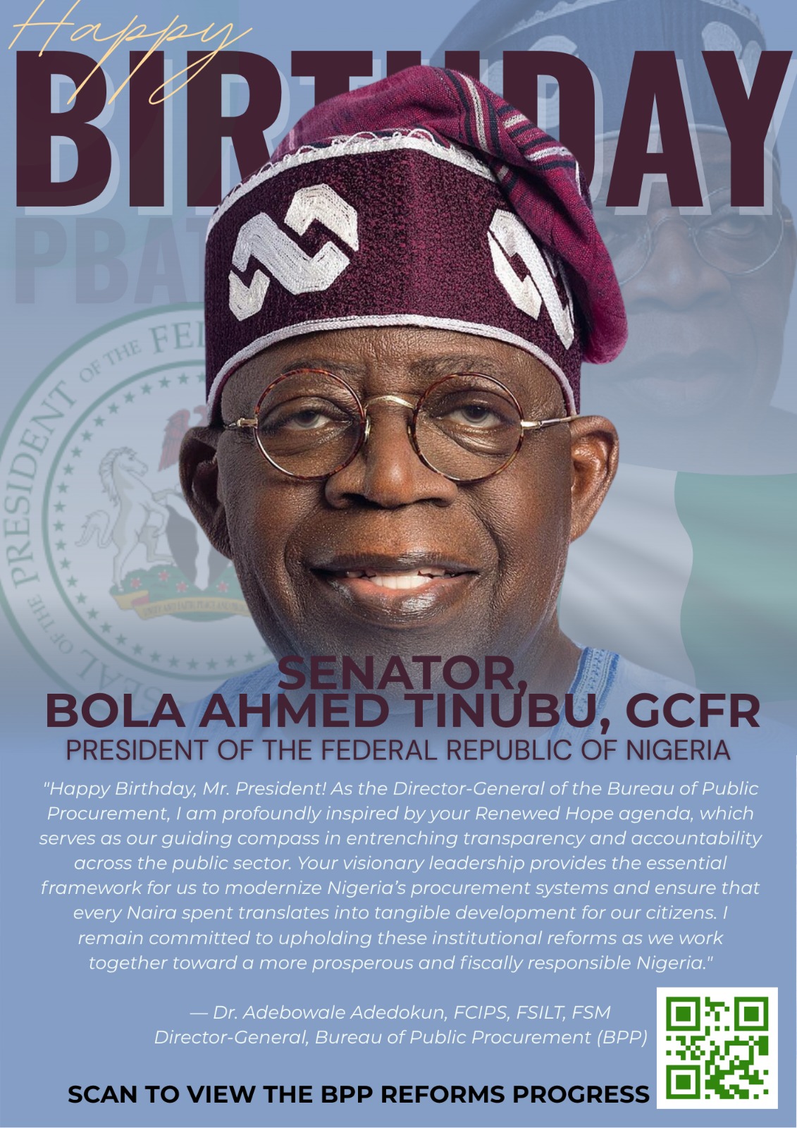 Dr Adebowale Adedokun, Director-General, Bureau of Public Procurement (BPP), has extended warm felicitations to President Bola Tinubu on the occasion of his birthday.